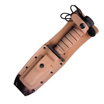 These rugged military-issue knives have been serving our military for over 50 years. Each knife is manufactured in accordance with US government specifications. Sawteeth on spine. Steel butt cap. Leather sheath with sharpening stone and tie down cord. Blade Detail: Sawtooth. Blade Finish: Zinc Phosphate. Blade Length: 5.00. Blade Material: 1095 Carbon Steel. Blade Thickness: .187. Carry System: Leather Sheath. Handle Color: Brown. Handle Material: Natural Leather. Length: 9.50.