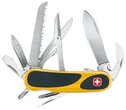 In 2005 Wenger created the first ergonomic Swiss Army Knife, making resourcefulness more comfortable than ever before. Now the EvoGrip expands on that advance. The four major areas of contact your hand makes when utilizing the EvoGrip S18 Swiss Army Knife are embedded with non-slip rubber and a locking blade, increasing its safety, performance and efficiency. EvoGrip Swiss Army Knives are truly a symbol of our unwillingness to be satisfied with a classic � even after more than a century. With 11 implements that perform 15 functions, the EvoGrip S18 Swiss Army Knife is as useful as it is advanced. The hi-visibility yellow body helps you see it even in the bottom of a backpack. Ergonomic handles with rubber. Laser engraved WPER logo. 2.5" Locking Blade. 2.75" Double-cut wood saw. 2.4" Springless scissors with serrated, self-sharpening design. Patented locking screwdriver. Cap lifter. Wire stripper. Can opener. Nail file. Nail cleaner. Phillips head screwdriver. Reamer. Toothpick. Tweezers. Key ring.